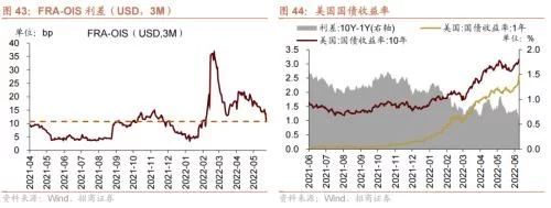 6月6日-6月10日,短、长端美债收益率上行,利差缩小,FRA-OIS利差缩小。美国1年期国债收益率上行40.0bp至2.58%,10年期国债收益率上行19.0bp至3.15%,利差缩小21.0bp至0.57%,截止6月12日,FRA-OIS利差为10.75bp,较前期(6月5日)下降3.55bp,处于2010年以来的8.89%分位。