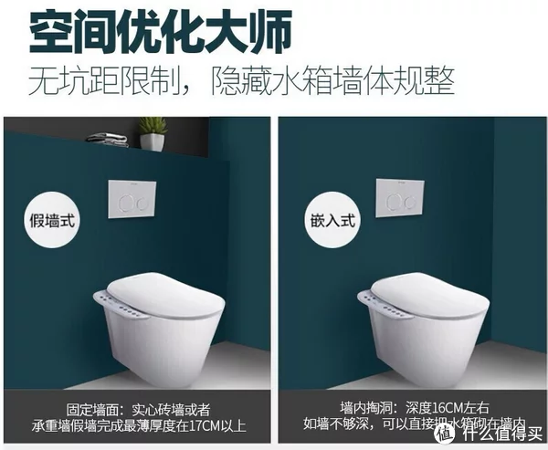 壁挂马桶对安装没有太多条件要求,有嵌入式和砌假墙两种安装方式,如果安装水箱的墙面是厚度大于18cm的实体墙,可以做嵌入式安装,如墙面不满足要求可以砌假墙安装。