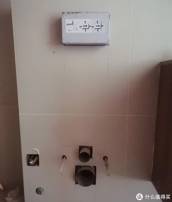 水箱挂件安装要确认排污管中心点距离地面瓷砖完成面的高度,马桶底距离地面8-9,这样才能保证马桶坐圈距离面40-42,过高过低坐上去都会很难受。太低扫地机器人进不去,太高腿部悬空坐在上面不舒服。和其他高度设计不同,壁挂马桶的预埋是在水电施工阶段,一定要同时跟水电工瓦工对接好,设计好铺完瓷砖的高度以及水电位置。