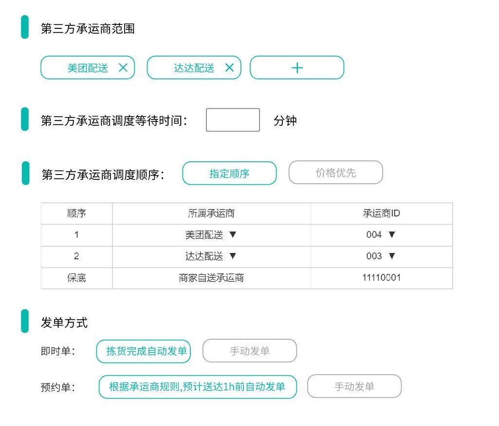 - 根据预设顺序依次呼叫:如创建订单失败、或承运商在预设时间内,仍无骑手接单或承运商直接抛异常,则呼叫下一承运商。