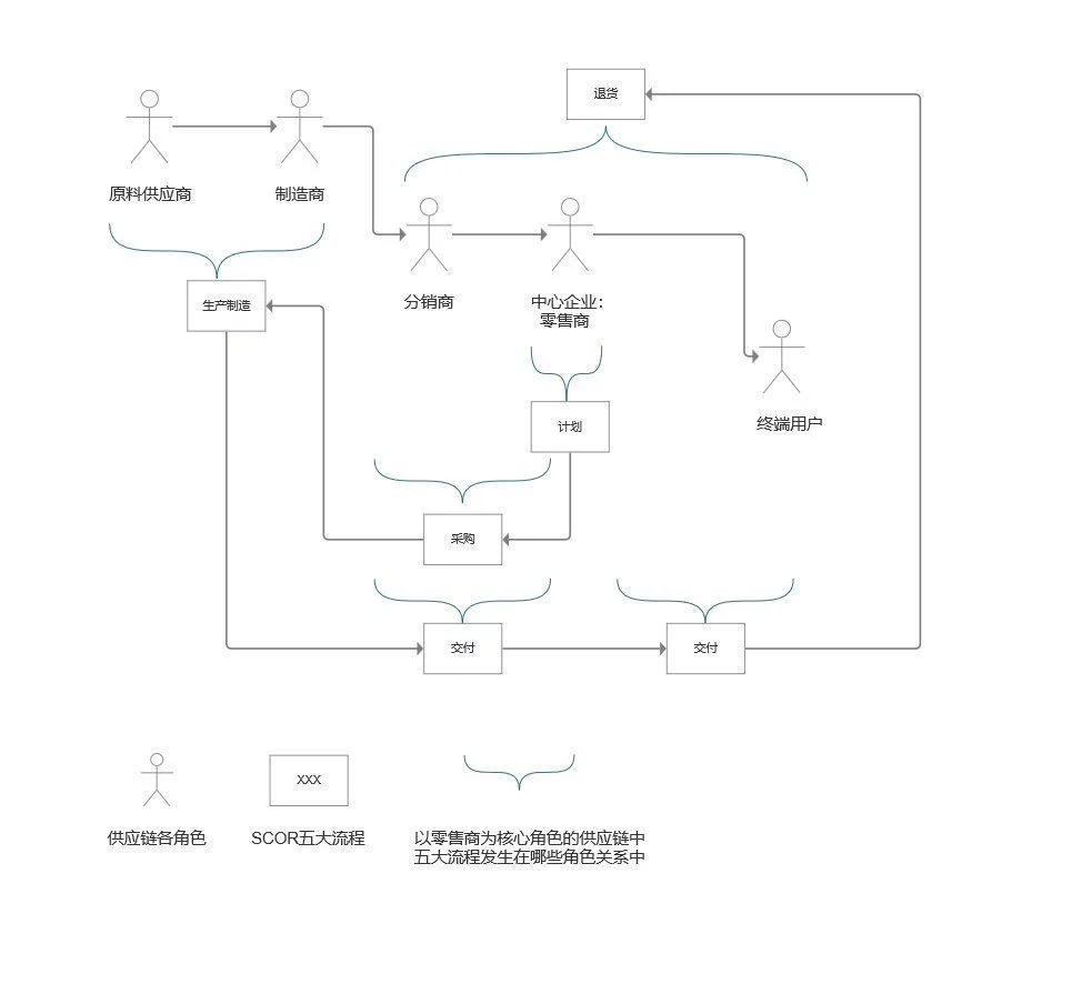 在开始正式设计之前,需要分清物流配送系统是做什么的,以及几种物流方式。在供应链系统模型(SCOR)中,配送属于在五大流程中的【交付】流程,一般发生在分销商和零售商以及零售商和终端用户之间,但OMS系统中仅涉及到零售商和终端用户间的交付。