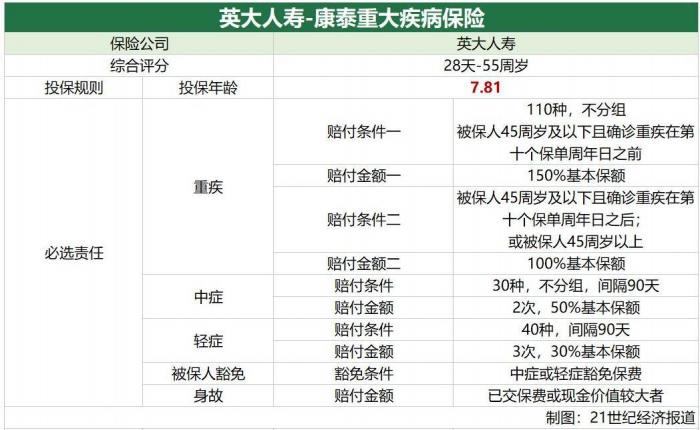 英大人寿的康泰重大疾病保险,综合得分7.81分,保障力度得分26.85分,排名第三,推荐指数两星半;