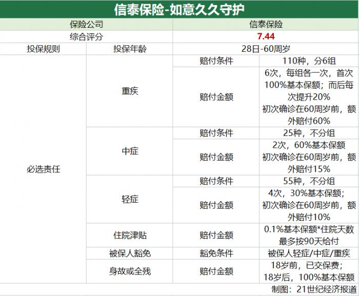 本期测评的最后一款产品是来自于信泰保险的如意久久守护。综合评分7.44分,综合排名并列第四,保障评分29.20分,保障力度排名第三,推荐指数两颗星。