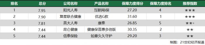 综合排名第一位的是阳光人寿的互联网i保,综合得分7.95,保障力度得分27.20,排名第四,推荐指数三颗星;