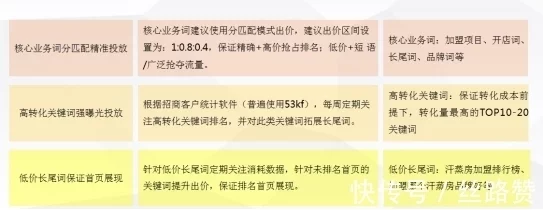 投放关键词类型:重点覆盖产品/项目词、加盟项目词、长尾词、疑问词、品牌词