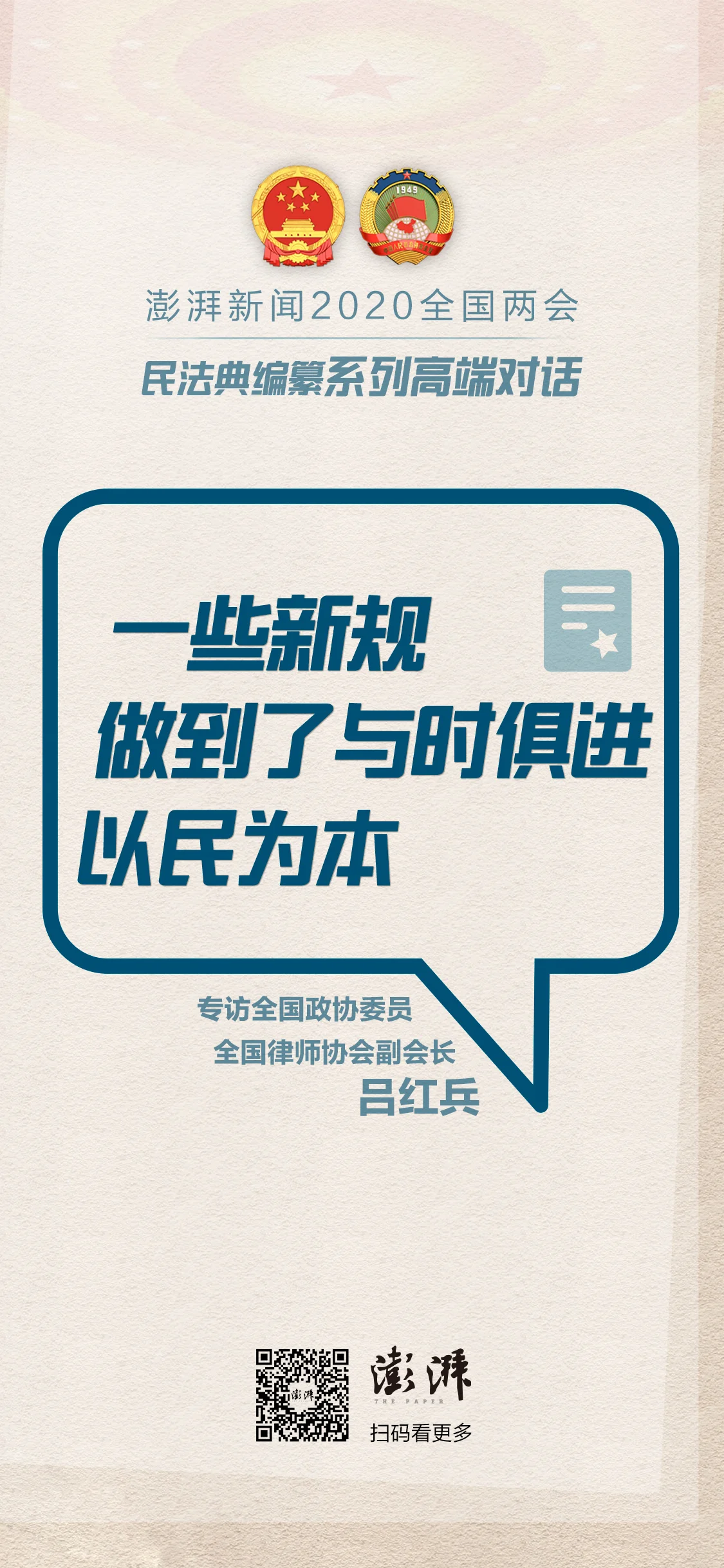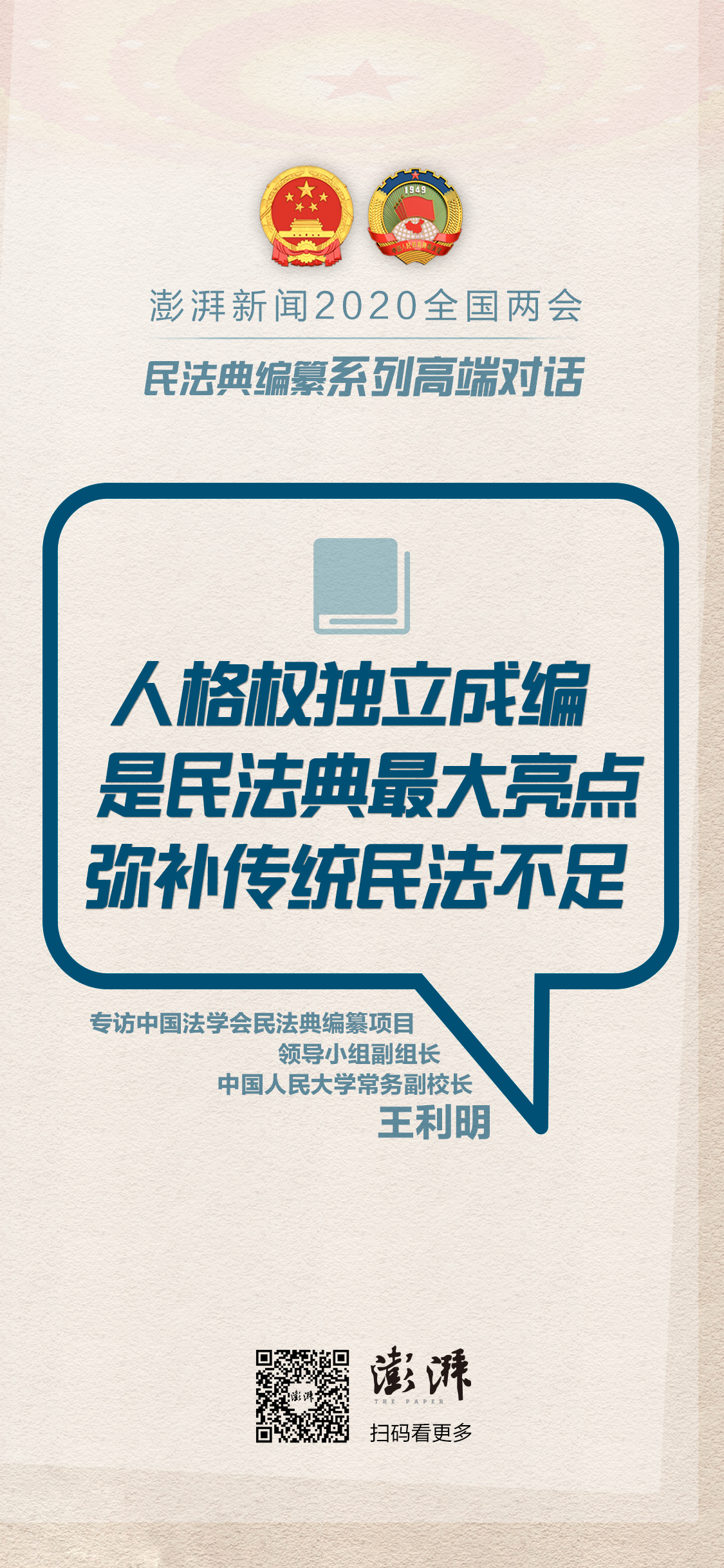 今年全国两会期间,就新中国第一部民法典的编纂问题,澎湃新闻专访了中国法学会民法典编纂项目领导小组副组长王利明及多位领导小组成员,全国政协委员、全国律协副会长吕红兵等多位法学界人士,就即将到来的民法典时代做了深入的探讨。