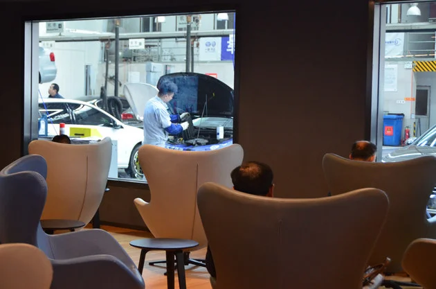 8.维修保养区;在客户休息区旁边就是维修保养工作区,维修保养区也是开放式的设计,不仅能方便客户的咨询,也更方便与销售的联动,在保养交流过程中如果有客户有购买新车或者置换等需求,或许也可以成为再次购买的群体,这种方式也被称之为饱和营销。