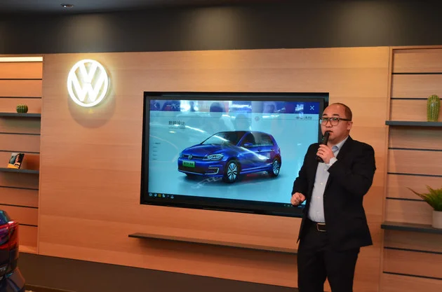 4.新能源展车区:除了传统的燃油车展区之外,一汽-大众还在店内为新能源车型专门设置展示区,未来随着ID.4上市后,就会摆在这部分展区,这部分展区同样设计选配投屏,尺寸要更大,同时还有触控功能,除了选配之外,还实时寻找充电桩,同时这部分展区也有可以坐下休息的地方非常人性化。