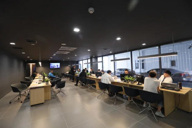 先来简单介绍一下整个展厅,进入展厅之后,扑面而来是强烈的现代感和家居感,给人一种宾至如归的感觉。展厅一半面积几乎都是用来展车,在两侧以及后方分散布局一些洽谈区,还有品牌周边以及轮毂、漆面的展示区,中间有部分空间是用来给工作人员办公,后半部分则是保养维修部门以及客户的休息区和办公区,同时店内还设有吧台,可以购买一些饮品和吃食,整体4S店都是那种开放式的设计,可以说整个环境是非常惬意。