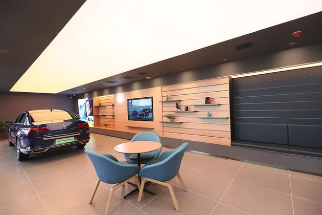 整体感觉下来这并不像一个日常的4S店,而更偏向于多功能体验店,其实在不少一线城市,有很多品牌也设有自己的体验店,但不会大面积的布局,仅会设置几家,除了日常4S店功能外,还是提升品牌形象的一个展示。但作为一汽-大众新标准展厅,这样的展厅设计会进行全国的铺设,走进每家一汽-大众的4S店,可见其有多大手笔。