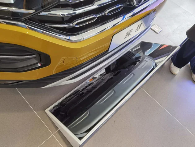 10.中央屏风和斜置镜子:这两个其实属于细节了,进门会有一个透明屏风设计,这个是根据中国人的建筑习惯进行的设计,上面会有欢迎语,让你一进门就有亲切感。另外,在部分展车还设置有斜置的镜子,让你不仅能看到车型外观、内饰还能直观的看到车型底部,不用弯腰屈膝,非常贴心。