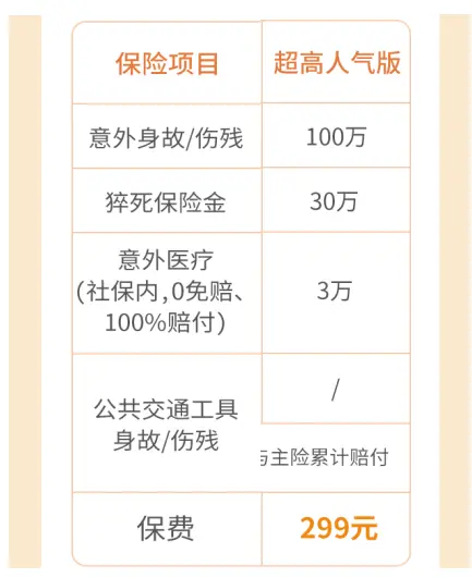 同样的列子回过头来看看,小明他总共花了4万,但是花的4万。这个费用当中,它社保范围内的只有2万。还有2万的费用是属于社保范围外的项目被用药的,所以不能报,那相当于他社保范围内的这2万可以得到全额报销,因为是零免赔百%赔付。所以这款意外产品它可以得到一个60万的伤残赔付和2万的意外医疗赔付。这款产品价格是299。刚刚第一款产品价格是1699。但是不同的区别在于这一个它是消费型的,它没得还。