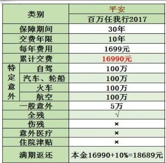 我们现在来看一下这个产品,首先第一它就是保30年,然后交10年,每年交1699,交10年其实就交16990元。保30年保什么?首先第一它是保特定的意外,就自驾、汽车、轮船、轮船、火车、航空都有100万,但是他有一个一般意外它的是5万。它的优点是到了满期也就是30年到期之后,他会返还,把保费还了,并且还给10%的收益,所以相当于到时候30年之后如果没有理赔的情况下,可以拿到18,000多,这是他的优势返还。