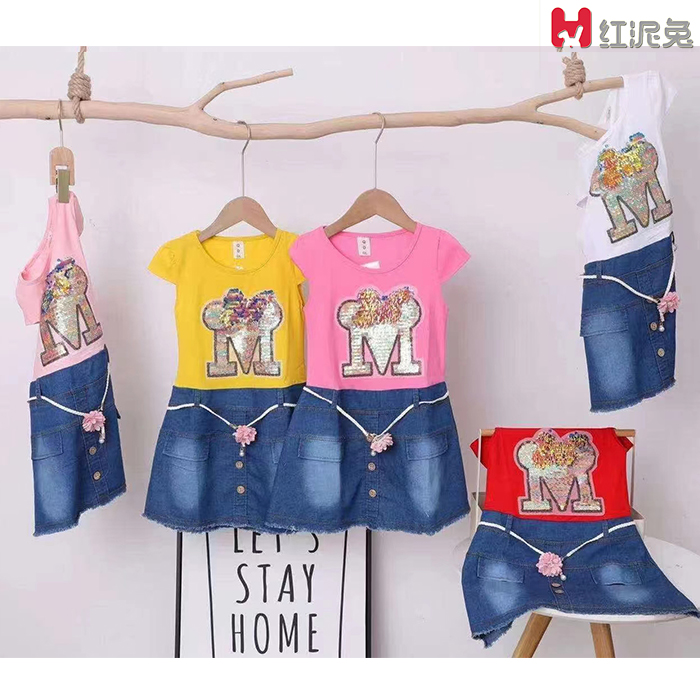 女童上品夏装新款女孩印花短袖圆领T恤拼接系带连衣裙