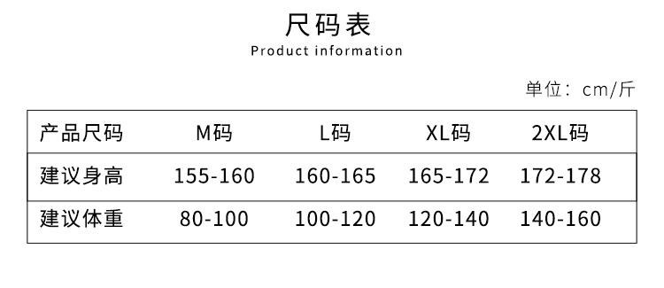 - 尺码:160(M) 165(L) 170(XL) 175(2XL)