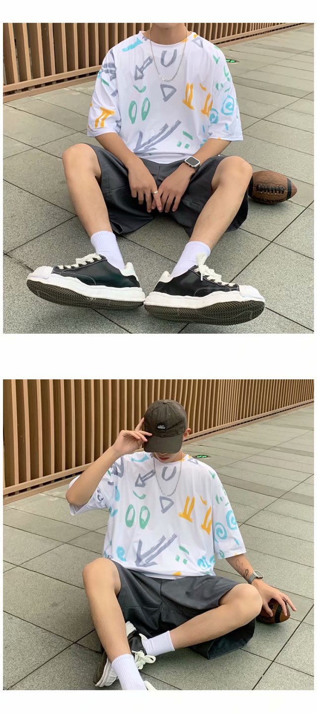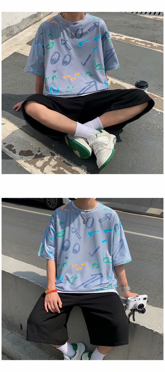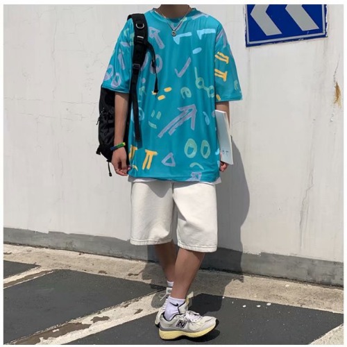 2021夏季新款新型蚂蚁皱布料短袖短裤潮流印花运动时尚休闲套装男