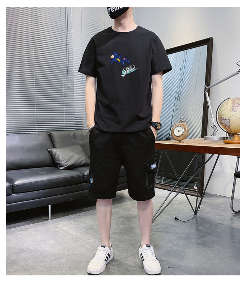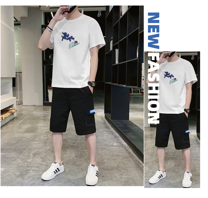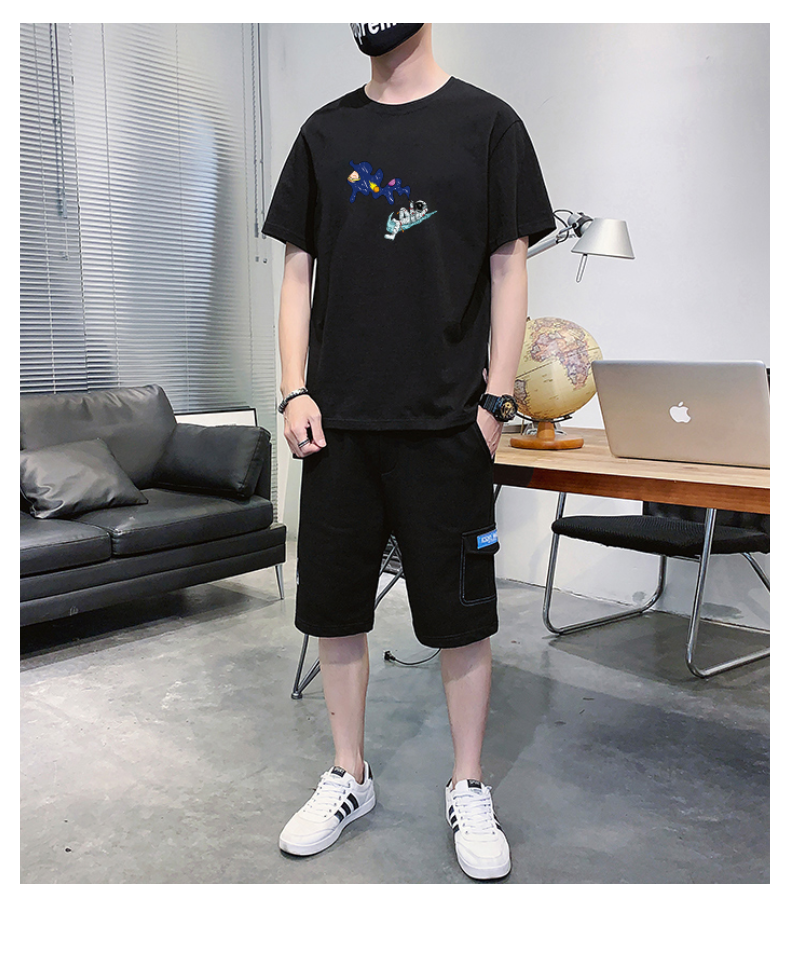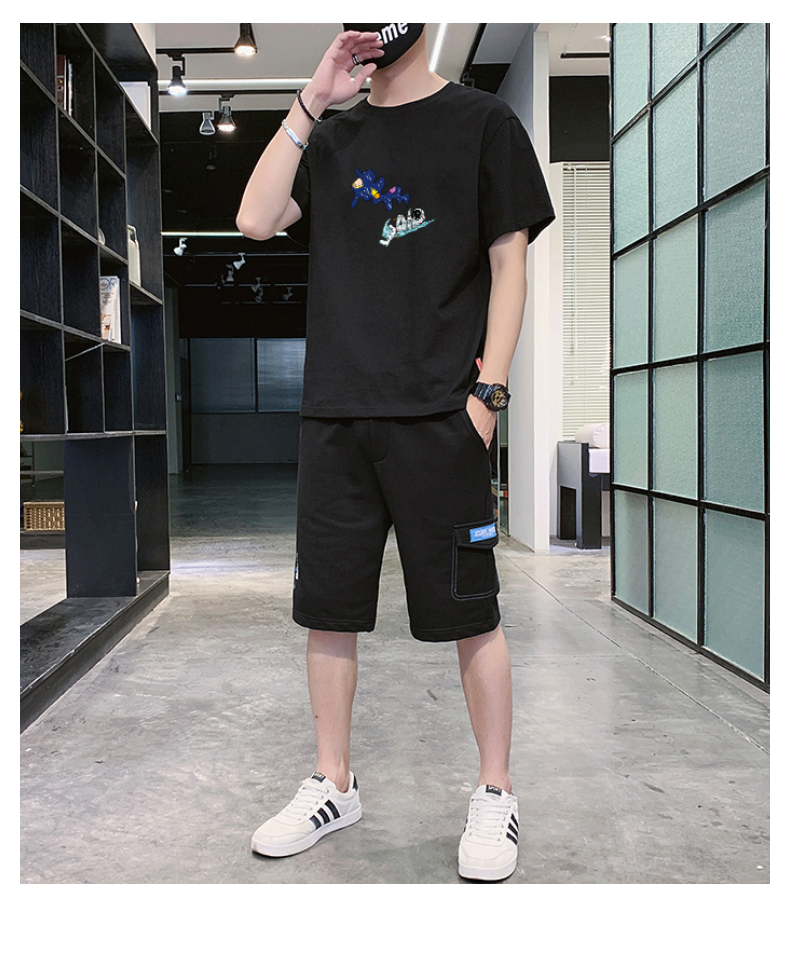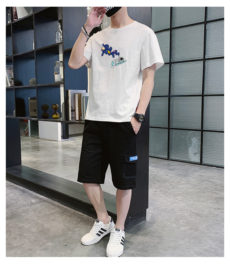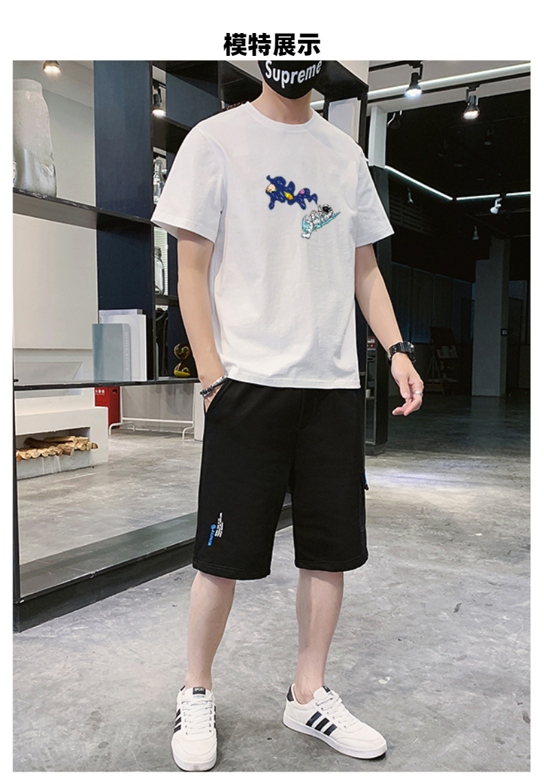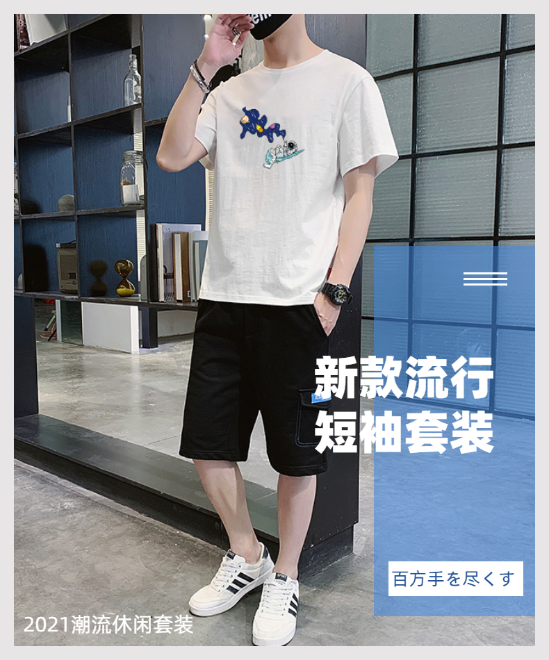 2021夏季新款新型蚂蚁皱布料短袖短裤潮流印花运动时尚休闲套装男