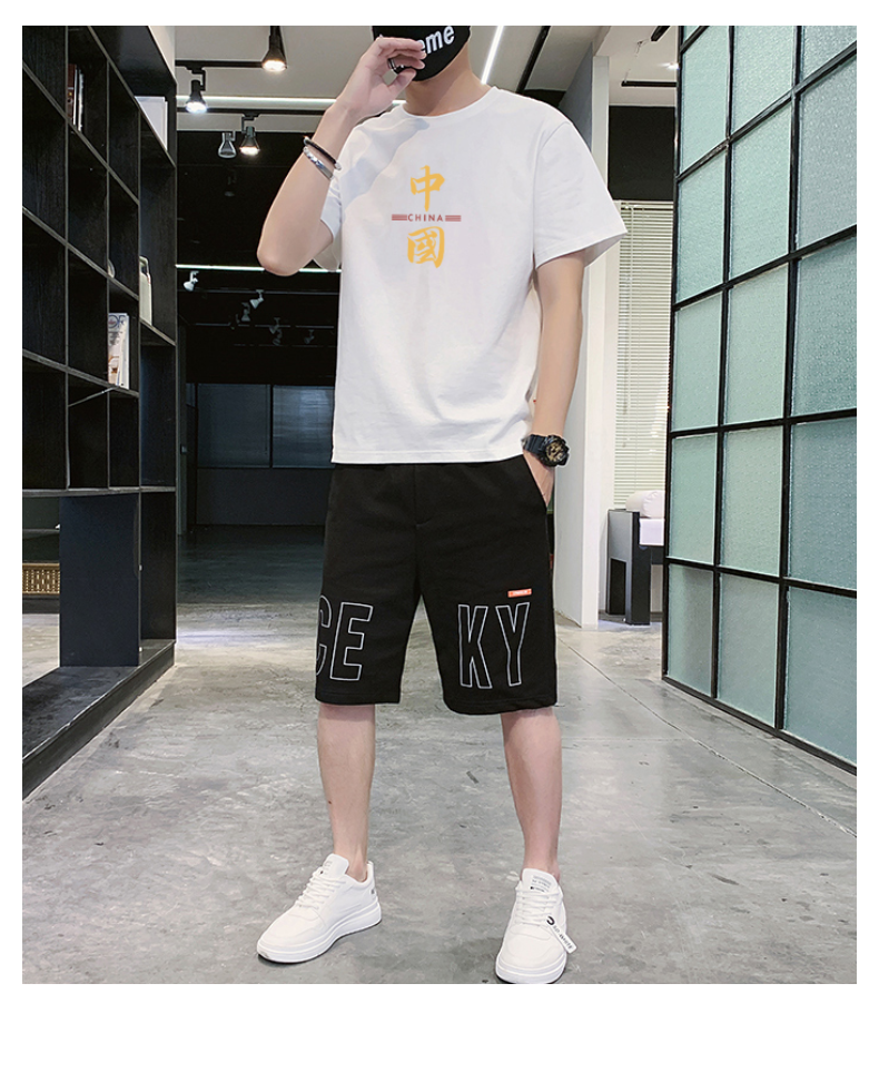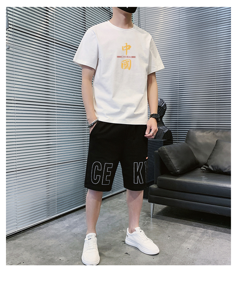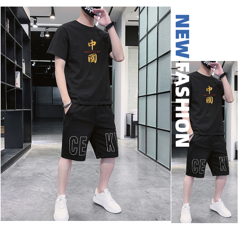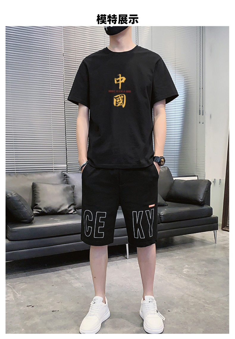 2021夏季新款新型蚂蚁皱布料短袖短裤潮流印花运动时尚休闲套装男