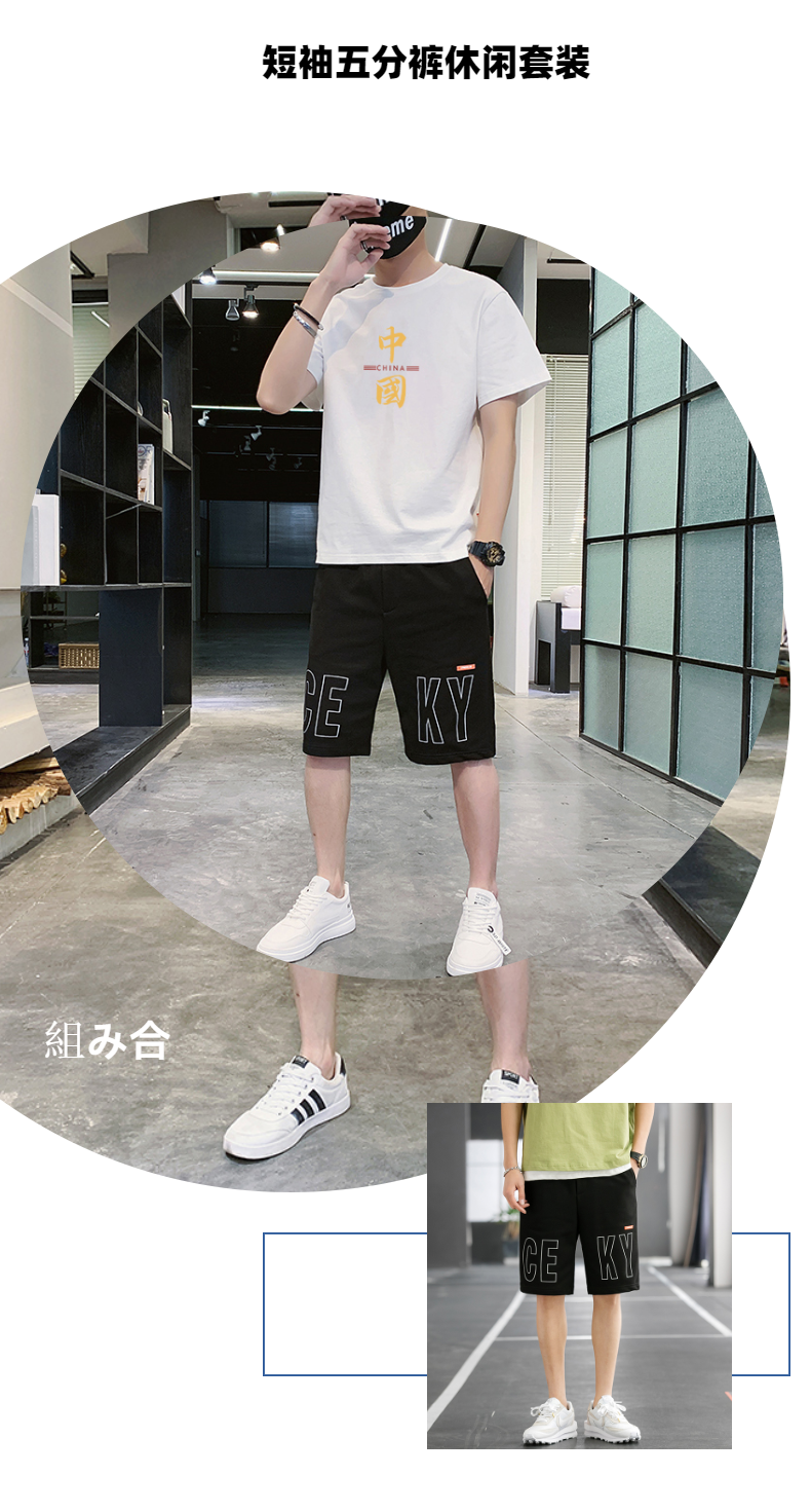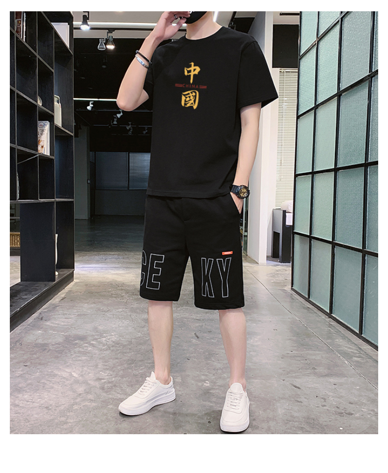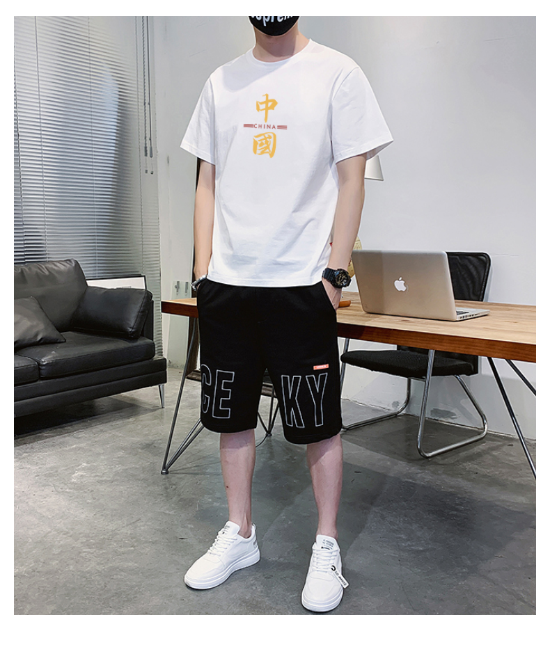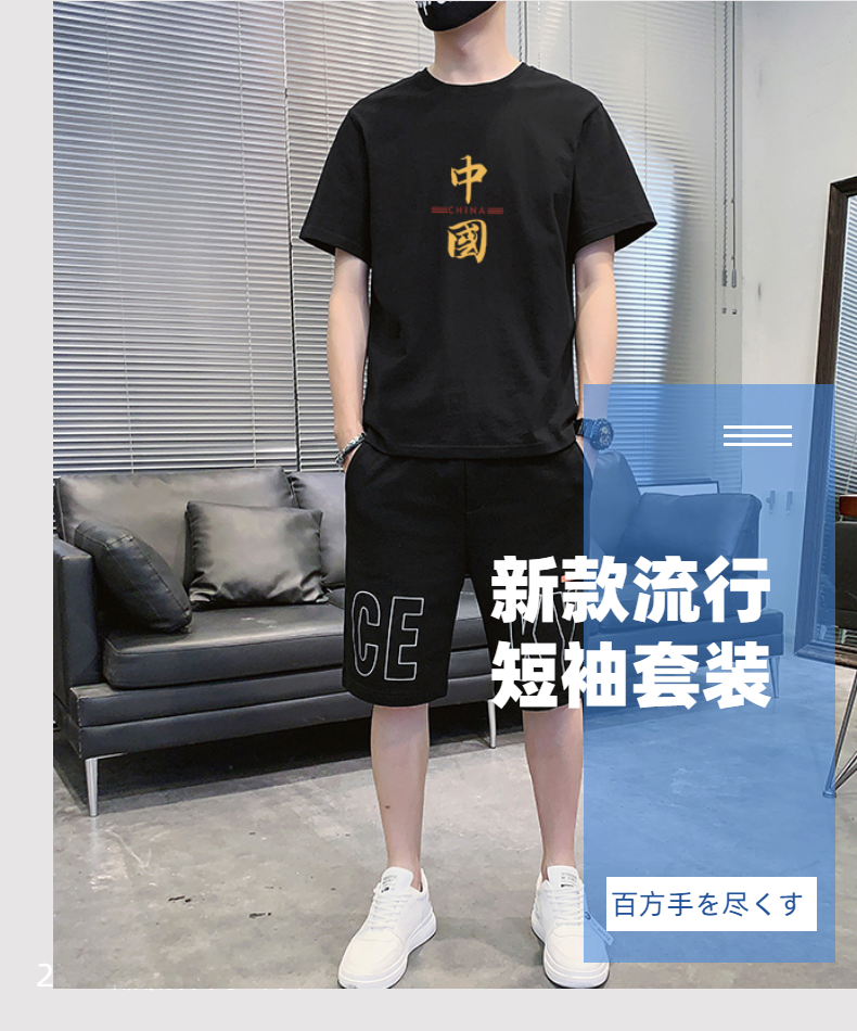 2021夏季新款新型蚂蚁皱布料短袖短裤潮流印花运动时尚休闲套装男