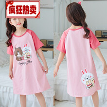 界方【新品】1-14岁6岁洋气小孩夏天穿的儿童睡裙女夏季短袖纯棉宝宝小孩小女孩公主亲子女童睡衣家居 玫红色 短裙粉兔熊 8码参考身高90-100【30斤左