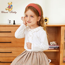 精典泰迪 Classic Teddy 女童长袖T恤女宝宝上衣女孩打底衫娃娃领外出服百搭春季 翻领小格子-白色 100