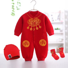 婴儿红色满月服百天周岁宝宝男女唐装连体哈衣保暖拜年春秋季衣服 新长命锁3件套 59码(建议0-2个月)