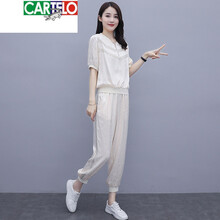 卡帝乐鳄鱼 夏天冰丝九分裤休闲裤两减龄2021年新款夏装炸街时尚休闲套装女装潮显瘦百搭 米色 L