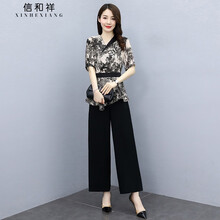 信和祥21年夏装新款夏季女装时尚气质宽松薄款休闲裤夏天高腰阔腿裤套装女长裤女士裤子裙裤 白花 XL