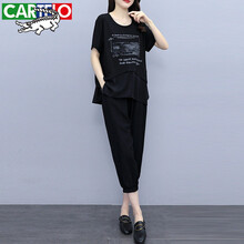 卡帝乐鳄鱼(CARTELO)特大码女装胖mm棉麻套装微胖遮肚子藏肉显瘦上衣阔腿裤两件装夏装 图片色 大码XL【建议110-125斤】