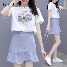 随影衣飘 印花连衣裙21年夏季新款牛仔短裙套装女网红炸街时尚小个子减龄鱼尾裙套装T恤+半身裙 图片色 M
