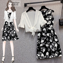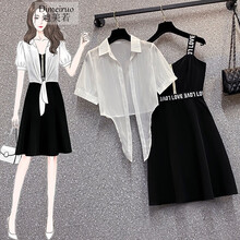 迪美若 吊带连衣裙女装套装2021夏季新款胖mm时尚网防嗮纱衬衫上衣显瘦减龄吊带连衣裙两件套套装 图片色套装(字母) 请拍正确尺码