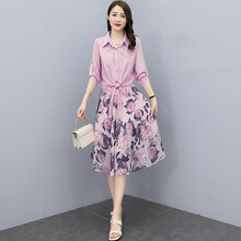 卖花女雪纺连衣裙套装女夏装2021新款名媛印花开衫洋气减龄两裙气质 粉色 L