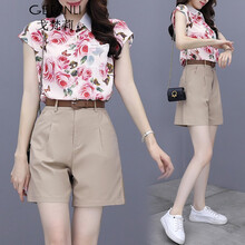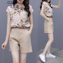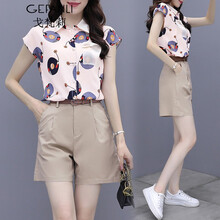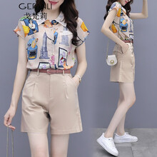 戈梵莉连衣裙2021夏装新品港风休闲套装女雪纺印花短袖衬衫气质显瘦套装时尚小个子两件套套装裙2163 卡通花套装 L(建议110-120斤)