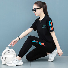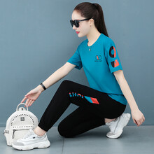 芷棠 运动套装女休闲套装女2021年新款夏装圆领洋气显瘦遮肚减龄时尚休闲装两件套 蓝色套装 L(建议95-110斤)