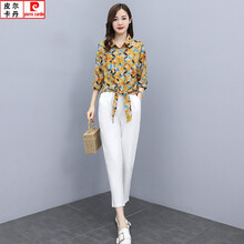 皮尔卡丹轻奢优雅棉麻套装女2021夏季新款韩范花色宽松减龄气质时尚港风休闲裤套装夏减龄 图片色 M