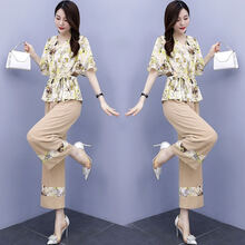 羽虹阁 时尚套装女阔腿休闲裤女装2021夏装新款气质减龄显瘦女神范两件装大码女装洋气炸街上衣套装 黄色 L