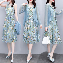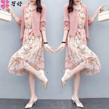 竽妤连衣裙女两件套装女2020夏新款气质中长款雪纺套装裙子女大码女装胖妹妹提花印花雪纺遮肚显瘦两件套 粉色 XL