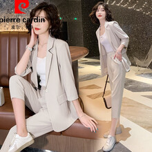 皮尔卡丹轻奢品牌 英伦风小西装套装女2021夏七分袖薄款炸街时尚减龄西服职业两件套针织 米白两件套 S