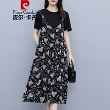 皮尔卡丹轻奢品牌女装 大码女装胖mm夏减龄初恋甜美吊带连衣裙假套装气质碎花裙子时尚女装 黑色 L 建议100-119斤