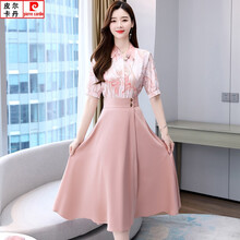 皮尔卡丹轻奢优雅女神范连衣裙套装2021新款夏季印花衬衫洋气减龄时尚半身裙套装夏减龄 粉色 M