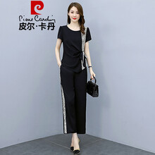 ℘皮尔卡丹品牌女装ℑ奢华高贵休闲裤女阔腿裤套装女年新款时尚宽松大码薄款阔太太冰丝套装裤时尚女装 黑色(两件) M