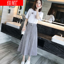 佳昭 连衣裙女套装裙T恤条纹半身裙沙滩长裙子夏季时尚新款韩版显瘦女神范淑女中国风中长款 白色T恤+条纹裙子 M