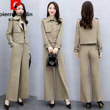 皮尔卡丹轻奢品牌 坠感阔腿裤两件套2021新款韩版时尚气质显瘦西装套装女秋休闲长裤针织 卡其色 M