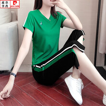 皮尔卡丹轻奢优雅潮牌运动套装女夏季休闲潮流时尚减龄显瘦七分阔腿裤套装夏减龄休闲裤 绿色 (V领+开叉黑裤) M(88-103斤)