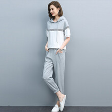 穆夏百合时尚休闲运动套装女上衣两件套套装裤子2021夏装新款夏季女装宽松纯棉卫裤休闲裤萝卜裤女九分裤 灰色 XL(约适合126-140斤)