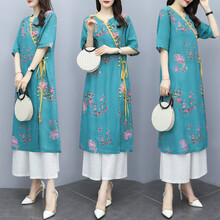 轻奢高端时尚棉麻套装女士夏装新款气质减龄2021夏装新款大码显瘦两印花上衣休闲棉麻套装女 两 S