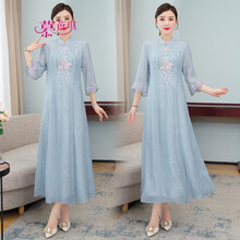 慕芭琪改良旗袍女2021新款中式汉服女刺绣遮肉立领宽松显瘦中长款民族风旗袍连衣裙子 蓝色 3XL