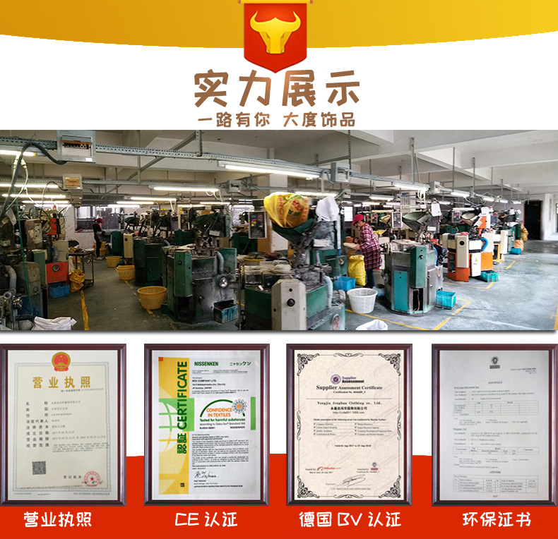 | 永嘉县大度服饰有限公司是一家专业型生产辅料及五金饰品生产厂家,本公司拥有雄厚的加工能力以及丰富的生产经验强大的营销团队,公司现主要生产各种树脂钮扣、金属纽扣、塑料纽扣、尿素纽扣、亚克力纽扣、木头纽扣、天然贝壳扣、三档扣、腰扣、对扣、弹簧扣、吊钟、珍珠扣、盘扣、工字扣、葫芦扣、暗扣、四合扣、橄榄扣、牛角扣、织带、拉链、织带、松紧带、装饰扣等;是一家集开发、生产、销售、贸易为一体的实质性企业,我公司可根据客户的需求生产符合国际标准性的无镍、无毒、无偶氮、过检针的各种环保要求产品,我们始终遵循“品质为本,客服至上”的企业精神,不断加强内部管理,拓展国内外市场,提升企业品牌形象,秉着“以人为本,科技为先,科学管理,以质取胜”的原则,为服装饰品行业再创新高。 |