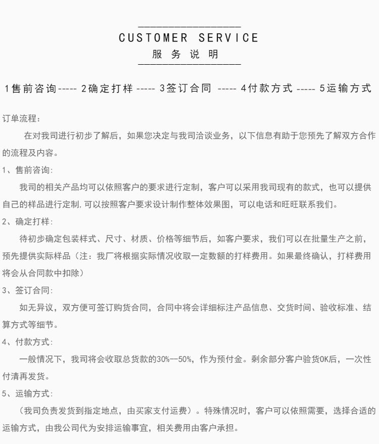 【货款】双方确认图稿后,请将货款拍付本店(支付宝提保交易),我们提供产品数码样给您查看,您确认后我方才可安排大货的生产。