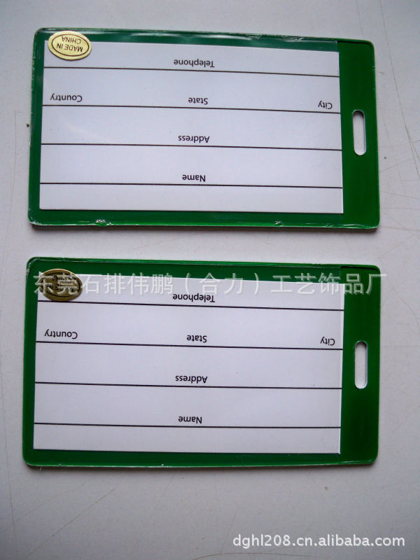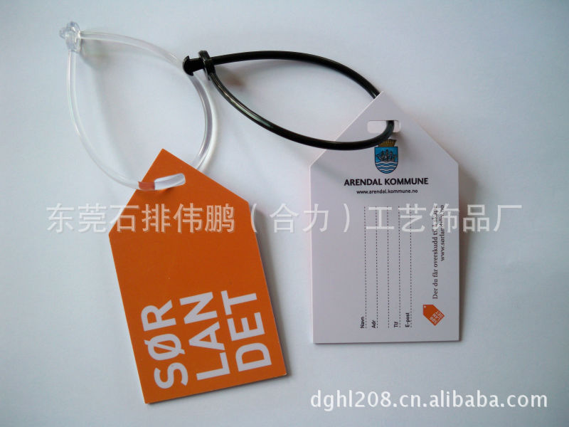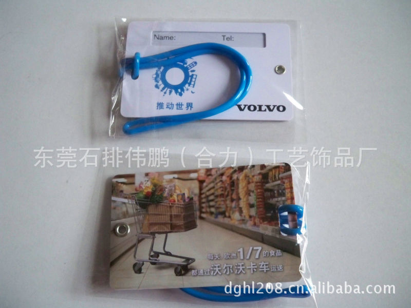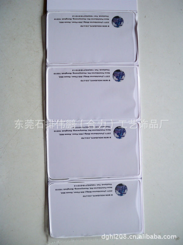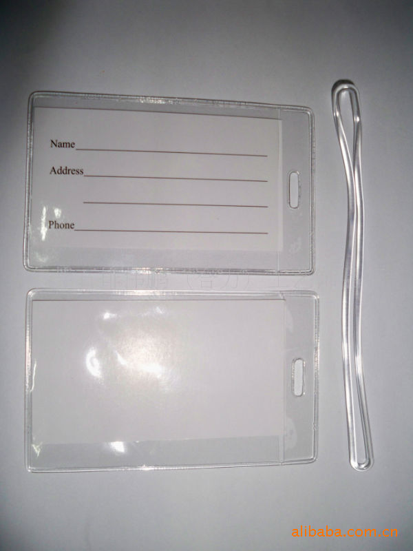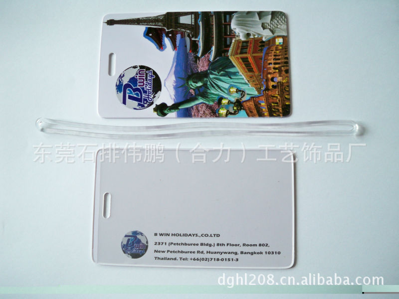 结构:硬胶PVC片可正反面印刷,电压成品背面是透明PVC片,中间可插放一张纸卡或名片(名片上可写联系人电话,地址,邮件等资料),配件透明绳或日字扣(灵活搭配)